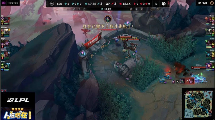 中期xiaohao潘森抢下第一条小龙并帮助EDG推掉下路一塔,Zdz剑魔随后在团战中打出双杀扩大优势。EDG在21分钟小规模团战中完成1换4,逐步拉开至5k经济差。