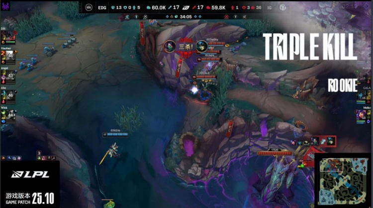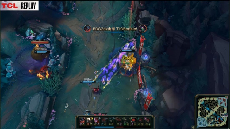 第三局开局阶段Jiejie蝎子来下配合双人组越塔打出1换1。随后iG多次围绕上路发力,Rookie阿卡丽支援到位击杀Angel阿萝拉,带动中野节奏。
