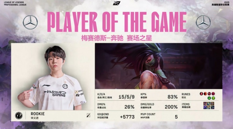 后期iG依靠Rookie阿卡丽的多次关键收割逐步追回局势,上路团战iG打出0换4并拿下大龙完成经济反超。虽然38分钟EDG一波尝试终结比赛失败,但Rookie持续在团战中打出伤害。最终46分钟中路团战,Rookie阿卡丽切掉Zdz剑魔完成三杀,iG团灭EDG后一波结束比赛,拿下最终胜利。