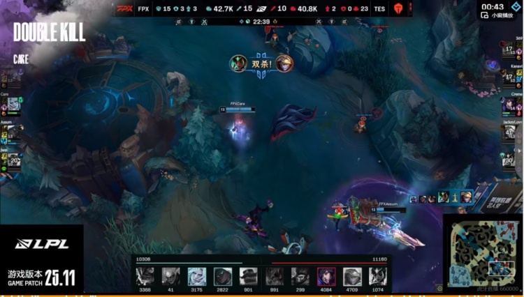 【15:28】FPX拿下峡谷先锋!随后想推上但是被Creme阿狸E闪+猴子大招秒掉了Assum塞纳!Care佛耶戈也被进场的369剑魔拦住!TES直接还了一波0换2!