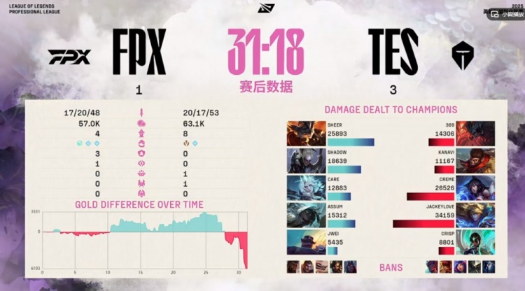 第四局FPX祭出黑科技中单佛耶戈,sheer兰博1级团还放线支援非常团队!过了对线期FPX几次连续抱团gank拿下成效,17分钟小龙团shad0w皎月勇敢开团,Assum塞纳三杀,这波FPX打出0换4,一度领先快4K的经济差!但是随后FPX想强拆上一塔结果双C白给!TES劣势局面下Creme阿狸连续魅惑命中,中路一波团战就是依靠阿狸绕后配合Kanavi猴子开转秒掉了FPX下路组!FPX三人想看大龙再次被开,TES再打0换2拿下大龙反超经济!最后一波团FPX强杀掉了阿狸,但是Kanavi猴子转大卷碎了FPX的后排!TES团灭FPX结束比赛,让一追三晋级四强!