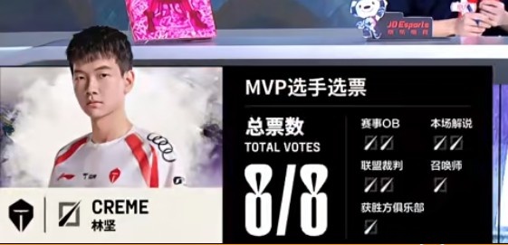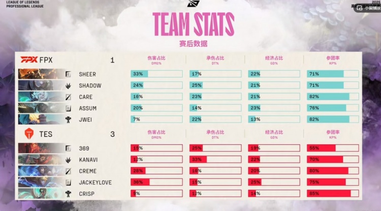 TES:上单369、打野Kanavi、中单Creme、下路JackeyLove、辅助Crisp
