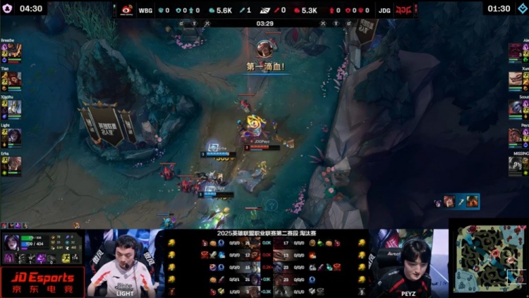 【18:47】JDG入侵WBG野区,Xun过墙被小天猴子开大搅飞,Light卡莎进场收掉Xun再杀Peyz梅尔拿到双杀,WBG中路放出先锋撞掉JDG二塔,Erha腕豪蓄意轰拳力保队友撤退,Scout不放WBG众人撤退,侧面Xiaohu加里奥进场控住Scout将其融化,Light卡莎反手瞬间三杀,Peyz梅尔复活吃掉Light卡莎大人头,xiaohu加里奥再一拳击杀Peyz,前者戒指来到10层。