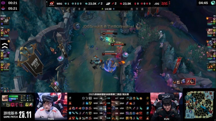 【17:23】Xiaohu加里奥埋伏上路草丛,Erha腕豪将Scout小炮抱回,后者交出W拉开,Light卡莎开大进场融化Scout,WBG打出0换3,推掉JDG上路两座外塔,JDG众人回到自家野区拦截,XiaohuTP落地被发现,WBG众人将其救走,双方拉开。