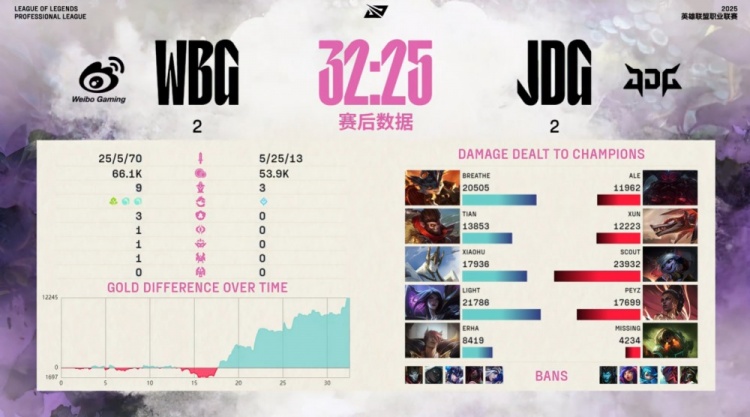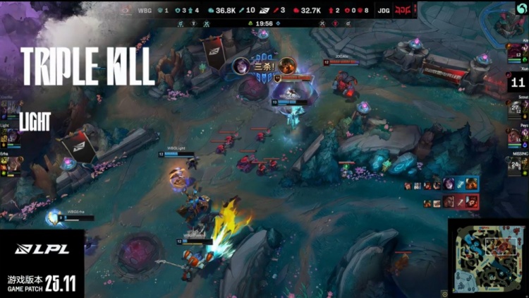 中期JDG围绕上路发力,Breathe兰博被三人击杀。WBG随即上路反抓Scout小炮,Erha腕豪与Light卡莎配合完成击杀并拆掉两座外塔。JDG野区反扑未果,Xun与Peyz先后阵亡,WBG中路推进破掉二塔,xiaohu加里奥控住Scout,小炮被融化后,Light卡莎完成三杀,Peyz复活击杀Light但随即被击杀。厄塔汗争夺中,JDG双人组被控,Scout再度阵亡,WBG打出0换5推掉JDG下路防御塔并吃掉厄塔汗。随后WBG击杀Xun拿下大龙,扩大经济优势。