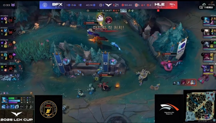 【24:10】河道团BFX集火想强杀Zeus格温但是被他残血金身直接秀了!Viper霞+Zeka维克托输出根本没人管,HLE一波轻松0换5团灭BFX,直接拉开经济差到12000了!