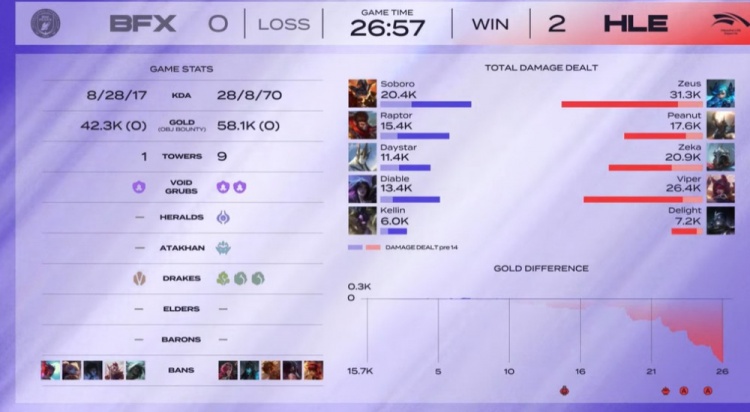 第二局BFX开局猛针对Zeus格温但是收效并不算好,HLE这边有潘森和慎的保护也让Zeus格温中期可以安稳发育!中期团战HLE三核轮流操作,BFX按下葫芦起了瓢根本没办法同时管住三个人啊!HLE连续赢团拿下荆棘厄塔汗扩大优势,24分钟河道团BFX想集火无解肥的格温但是被Zeus金身秀完了!HLE打出0换5之后上路再次0换5团灭BFX,大龙也不打了直接一波结束比赛,横扫BFX,以第二名的成绩结束常规赛!