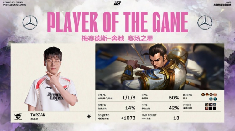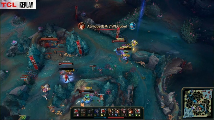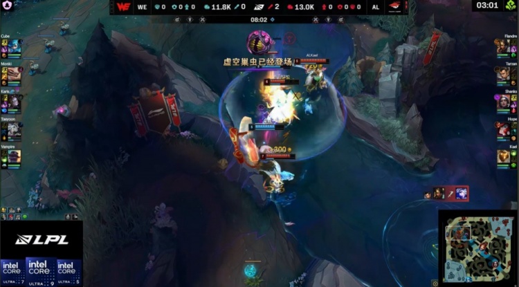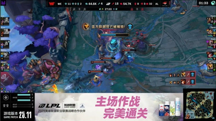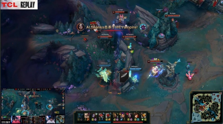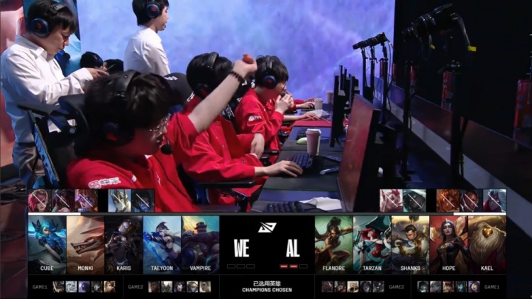 中期WE依靠正面小龙团控下资源,Cube格温双拳难敌四手被王杰女枪反杀,AL在随后的中路团战中通过Tarzan赵信和Flandre豹女先手击杀WE双C,扩大经济领先并拿下厄塔汗。