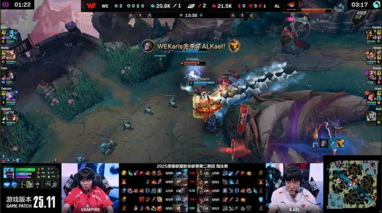 【22:16】中路团战,Taeyoon艾希一箭射空,Tarzan赵信捅Taeyoon打出后者闪现,王杰女枪点掉Taeyoon,Flandre豹女扑掉Karis发条,WE双C阵亡,AL打出0换2,回头吃掉厄塔汗,经济领先5k。