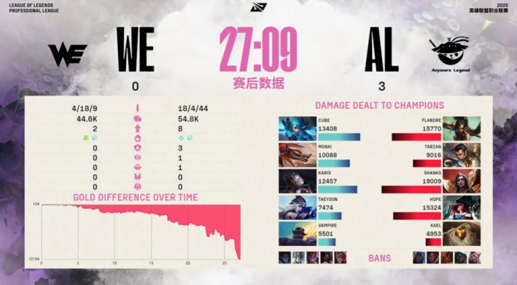 后期上路团战,Cube格温绕后斩获双杀不及王杰女枪三杀收尾,AL团灭WE。最终AL控下大龙后WE大火收汁,最终AL推平WE基地,连下三城赢得比赛胜利晋级,WE则掉入败者组。