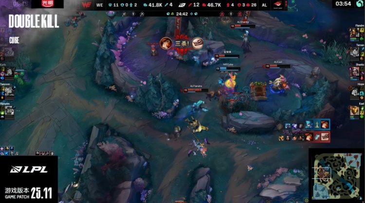【24:31】野区团战,Cube格温反手开剪双杀难挡王杰三杀,AL轻松打出2换5团灭WE,经济领先7k。