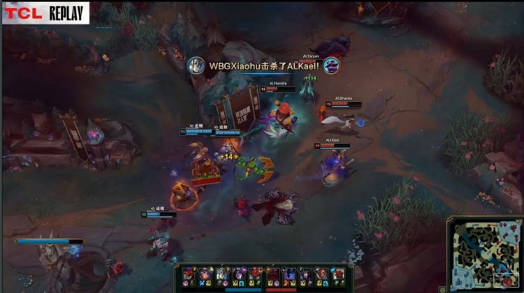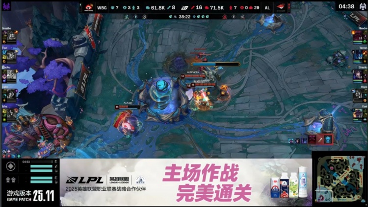 第四局前期双方持续和平发育,WBG在先锋团中凭借Tian莉莉娅的入场与Light卡莎的输出打出3换4,推掉AL上路一塔建立优势。