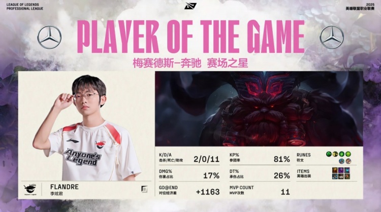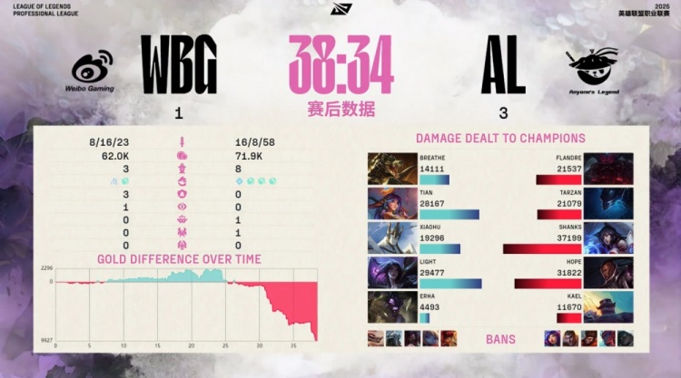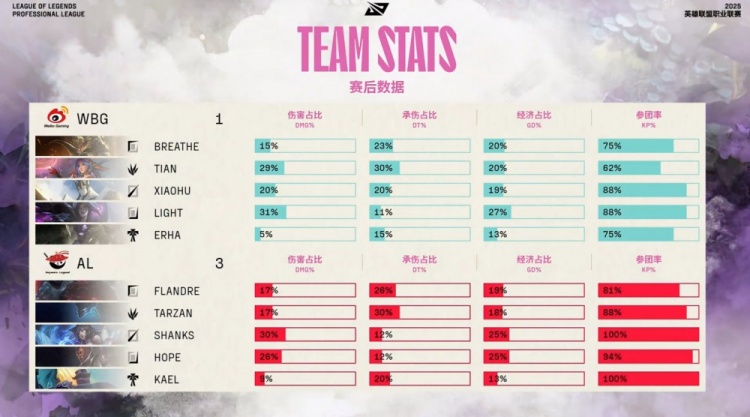 后期Breathe鳄鱼绕后开团未果,Flandre奥恩进场打散WBG阵型,Light卡莎飞后排秒掉Kael后瞬间闪现拉开未能收割,王杰卢锡安与Shanks狐狸联手打出高额输出,AL打出1换4并连控小龙与大龙扩大优势。最终龙魂团中Breathe鳄鱼瞬间被秒,Shanks狐狸完成三杀,AL打出1换5团灭WBG,一波推平WBG基地拿到比赛胜利。