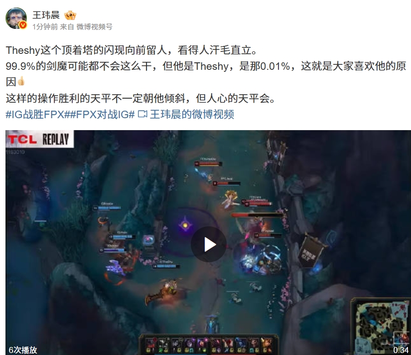 赛后媒体人王玮晨回看iG厄塔汗团战,表示:99.9%剑魔都不会顶塔闪现留人 但是他会!这就是大家喜欢他的原因