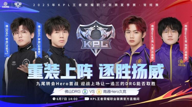 直播吧6月7日讯 2025KPL夏季赛今日第一场比赛是由佛山DRG对阵到南通Hero久竞!