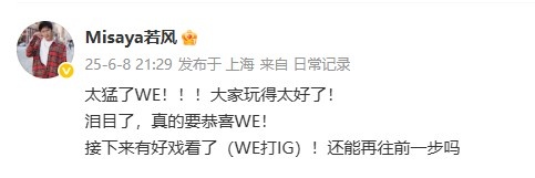 WE名宿选手Misaya发博:太猛了WE!!!大家玩得太好了!