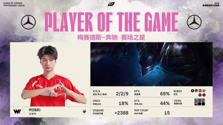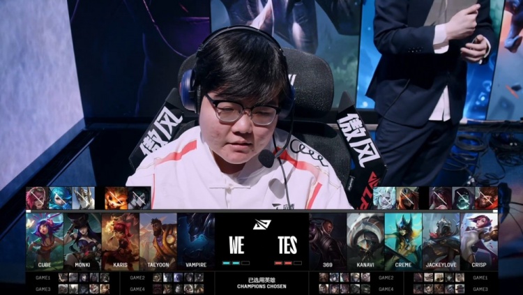 决胜局赛前Solo,Monki使用兰博击败369的鳄鱼。前期双方平稳发育,Monki梦魇关灯飞下配合Karis安妮秒杀Creme吃下一血,小龙团双方打野互换,Karis安妮斩获双杀,WE打出1换3拿到战斗先机,经济领先4k。