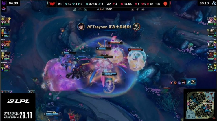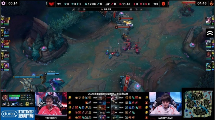 【20:46】河道团战,Karis安妮再拍Kanavi,Monki梦魇关灯配合Taeyoon女警输出拿到人头,Vampire妮蔻开TES三人,WE回头开厄塔汗,Taeyoon女警夹子封住三角草,TES三人绕到正面逼退WE众人。