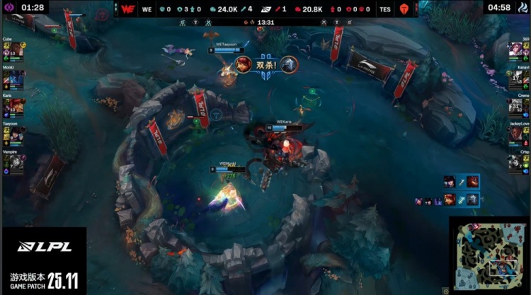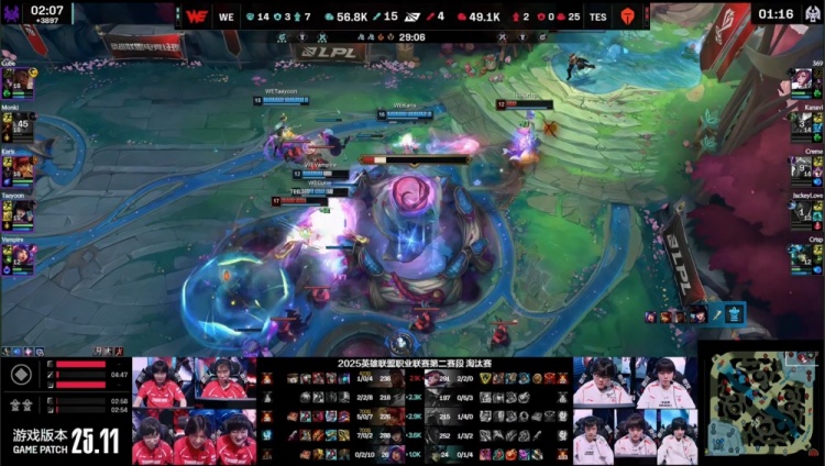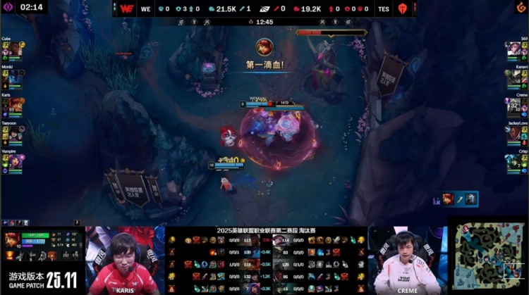 【25:03】WE中路推进,Karis安妮提伯斯拍脸击杀哥哥,WE打出0换1回头开大龙被逼退,TES推掉WE中路一塔止损。