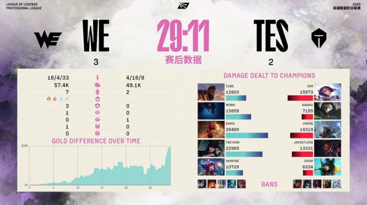 【27:29】369剑姬下路带线被Monki梦魇关灯冲脸配合Cube将其击杀,WE回头吃掉大龙,正面团战,Kanavi蝎子拉Cube无济于事,Taeyoon女警轻松双杀,Monki梦魇单杀Creme维克托,WE打出0换3推掉TES中路水晶,一波推平TES基地拿到比赛胜利!