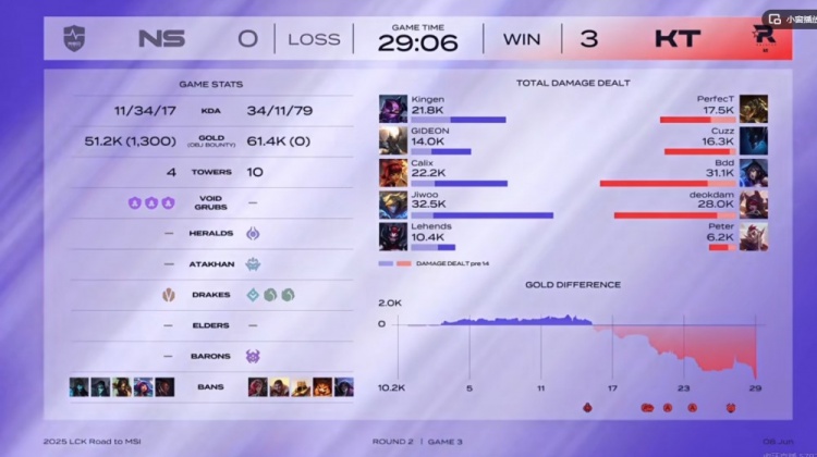 第三局比赛Kingen后手选出凯南补刀对位猛压PerfecT鳄鱼,但是连续gank想扩大优势强杀结果被KT各种支援反打强行打出人换人,0比2落后的局面下NS越打越急,越急越送,KT配合Cuzz梦魇关灯开飞连续反击成功!从20分钟开始的5分钟之内,虽然Jiwoo伊泽瑞尔连续秀操作强杀Bdd阿狸拿下一千块赏金,但是自己没双招连死三次,KT也是连续三波团灭NS直接杀死比赛!最终KT以比上轮横扫DK更快的速度又横扫了NS,淘汰赛6-0的成绩晋级下一轮,将要对阵T1!