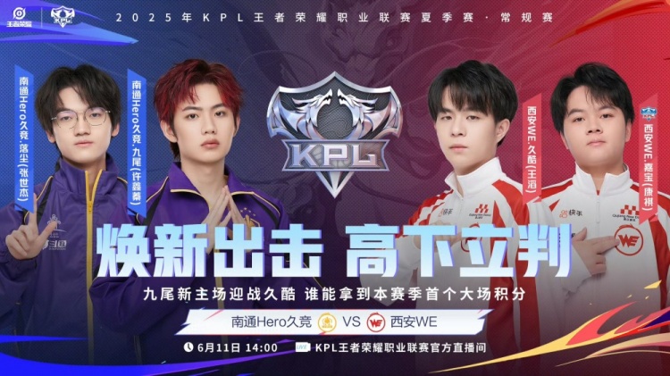 直播吧6月11日讯 2025KPL夏季赛今日第一场比赛是由西安WE对阵到南通Hero久竞!