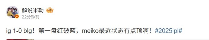 米勒看IG 1-0 BLG:第一盘红破蓝,meiko最近状态有点顶啊!