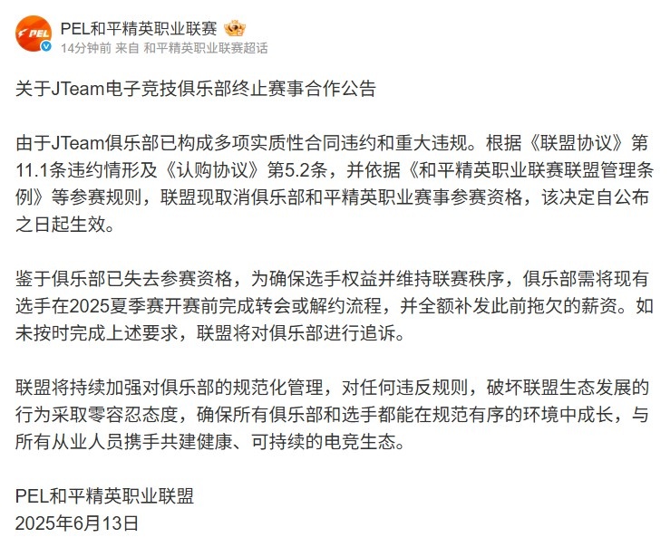 由于JTeam俱乐部已构成多项实质性合同违约和重大违规。根据《联盟协议》第11.1条违约情形及《认购协议》第5.2条,并依据《和平精英职业联赛联盟管理条例》等参赛规则,联盟现取消俱乐部和平精英职业赛事参赛资格,该决定自公布之日起生效。