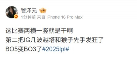 直播吧6月13日讯 LPL淘汰赛BLG 1-1 IG,赛后管泽元发文点评: