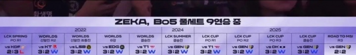 Zeka自2022年世界赛开始到2025LCK杯的九场BO5决胜局均取胜,今日被GEN终结。