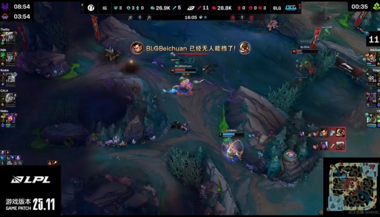 【17:32】河道团双方再次大混战,iG再次集火处理掉了knight蛇女,但是双方核心互打的时候Beichuan赵信又一次没人管了!一开始交链子残血的ON卡尔玛硬是拖到了最后,配合Beichuan赵信拉扯收割!最终这波BLG又是打了个3换5,相当于团灭了一波iG!