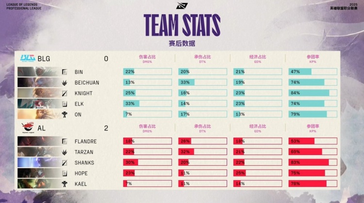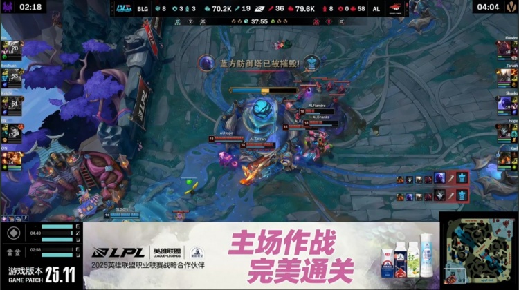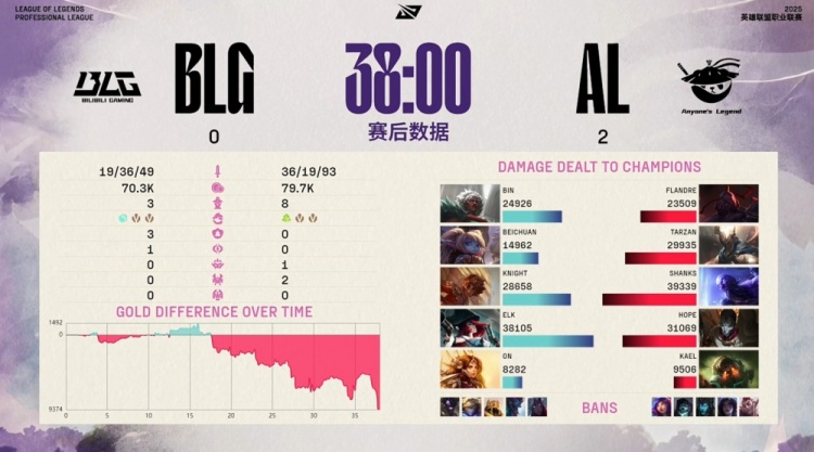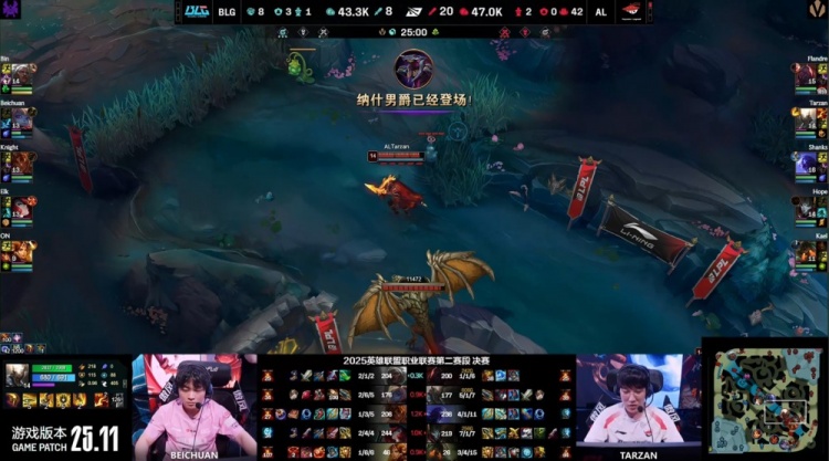 第二局开场BLG三人下路越塔三人被杀送出大节奏,Shanks瑞兹中路单杀knight岩雀进一步扩大优势。BLG中期依靠Beichuan波比与Elk女枪连续发力,控制小龙并将经济反超。随后Flandre赛恩与王杰烬在中路反打收获双杀,AL再度建立领先,推进过程中Tarzan潘森与Shanks瑞兹持续完成击杀,逐步扩大经济差距。