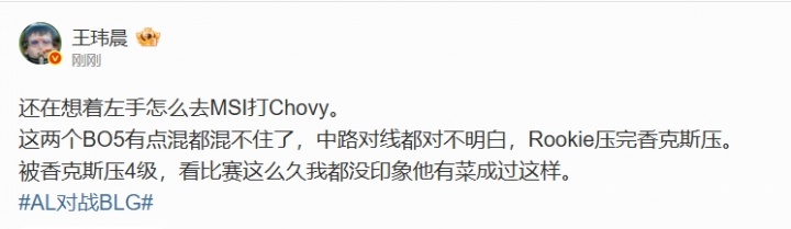 直播吧6月14日讯 LPL第二赛段决赛BLG零比二AL,赛后体坛周报记者王玮晨更博锐评:还在想着左手怎么去MSI打Chovy。这两个BO5有点混都混不住了,中路对线都对不明白,Rookie压完香克斯压。被香克斯压4级,看比赛这么久我都没印象他有菜成过这样。