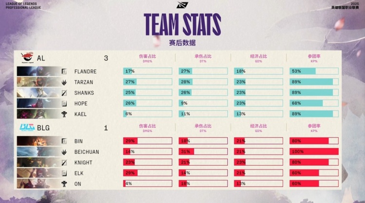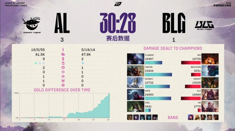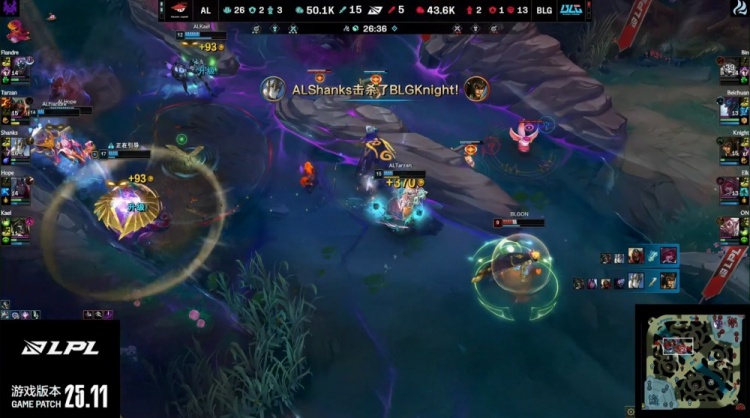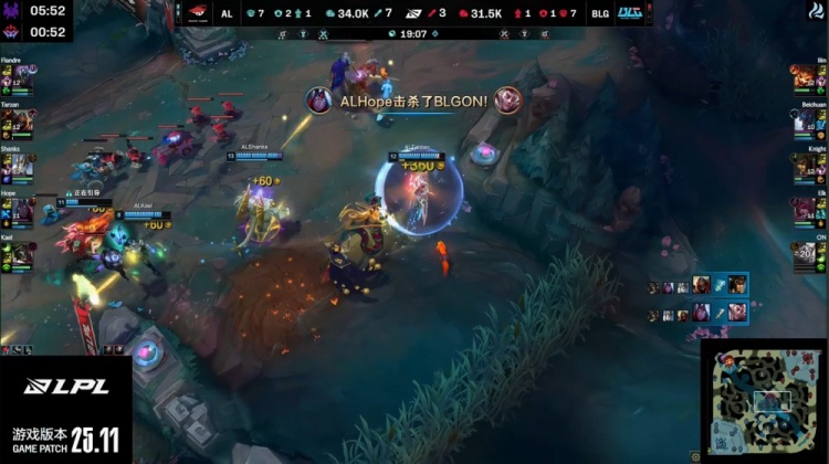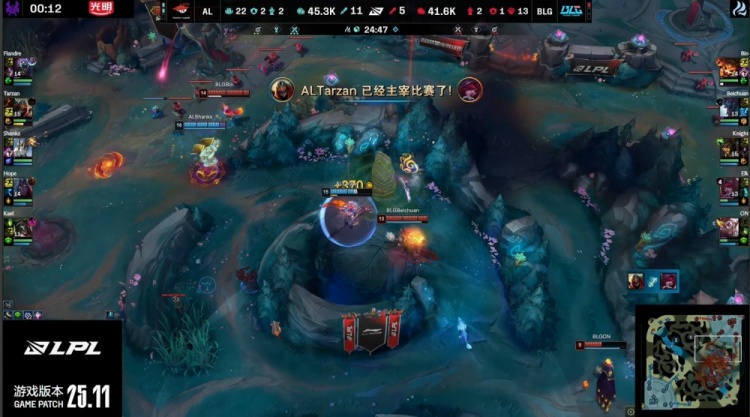 中期AL在先锋团中打出关键爆发,Hope韦鲁斯大招命中多人,Tarzan劫进场狂斩四杀,Hope补掉beichuan巨魔,AL团灭BLG。中路团战,Tarzan再秒knight,AL继续扩大经济差距。Tarzan随后拿下厄塔汗,AL打出1换2占据主动。