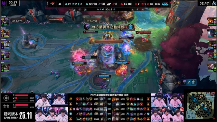 【29:11】AL中下推进,Elk又被Tarzan飞镖打残,AL推掉BLG中下两路水晶,大军压境AL强行一波推平BLG基地,拿到LPL第二赛段冠军!