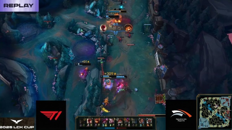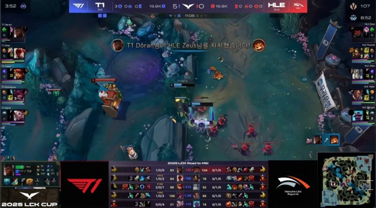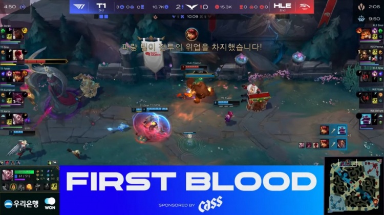 【9:59】上路混战,小吕布霞拔矛带走Zeka一血,随后Faker安妮闪现过墙拍熊击杀HLE下路双人组,Oner盲僧跟上再杀小花生豹女,T1打出0换4。