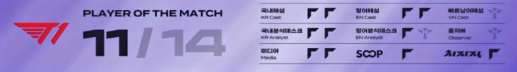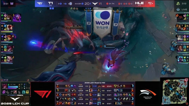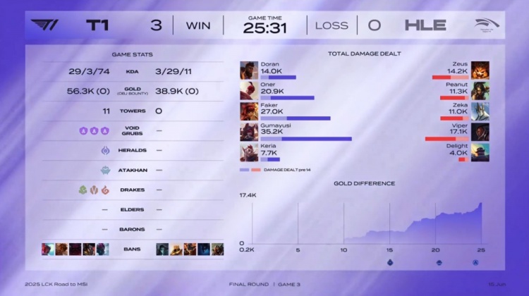 后期T1在野区持续扩大优势,17分钟T1就拿到1w经济优势,随后小吕布独自拿下厄塔汗,HLE完全溃败毫无一战之力,T1冲上HLE高地轻松推平基地,击杀比锁定在29-3,T1横扫HLE后晋级MSI!
