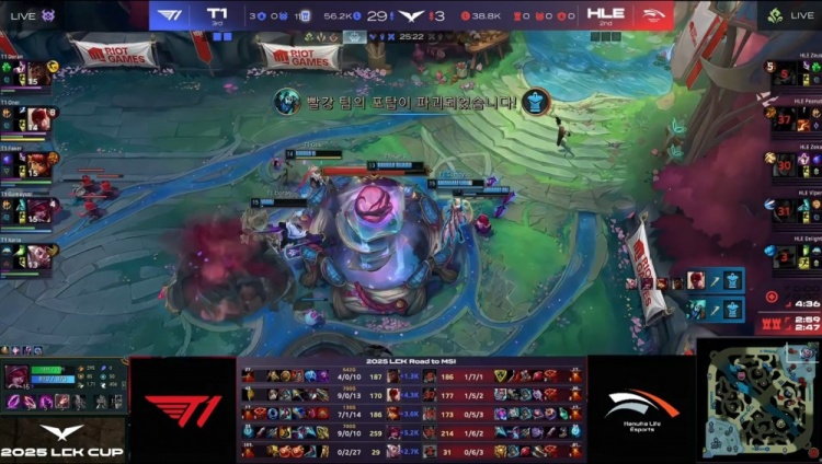 前期T1在巢虫团未战而胜,T1多人上路越塔,小吕布霞击杀Zeka加里奥拿下一血,Faker安妮闪现拍熊击杀HLE下路双人组,Oner盲僧追击带走小花生豹女,T1打出0换4建立优势。