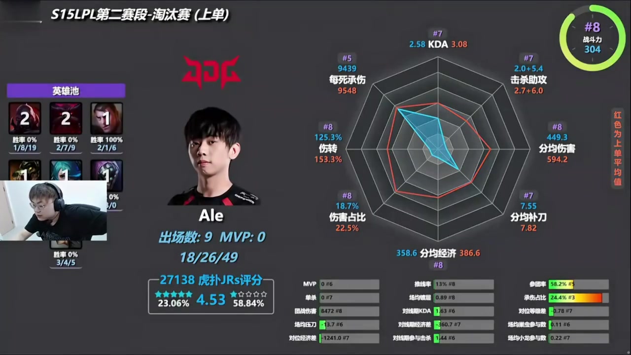 直播吧6月16日讯 近日Sask直播,看B站up制作的LPL第二赛段淘汰赛选手雷达图;