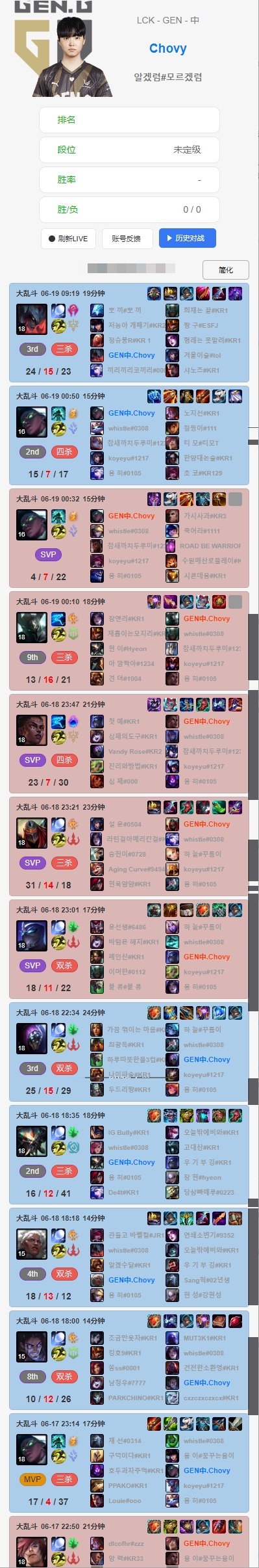 直播吧6月19日讯 LCK MSI资格赛GEN让二追三击败HLE晋级MSI,进入休赛期后,Chovy沉迷大乱斗,今早九点多就起来开始乱斗!