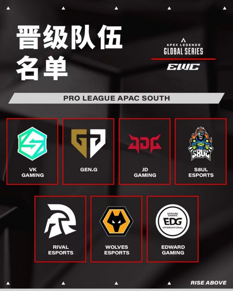 EWC更新APEX亚太南赛区队伍:VK GEN JDG S8UL RIVAL WOLVES EDG