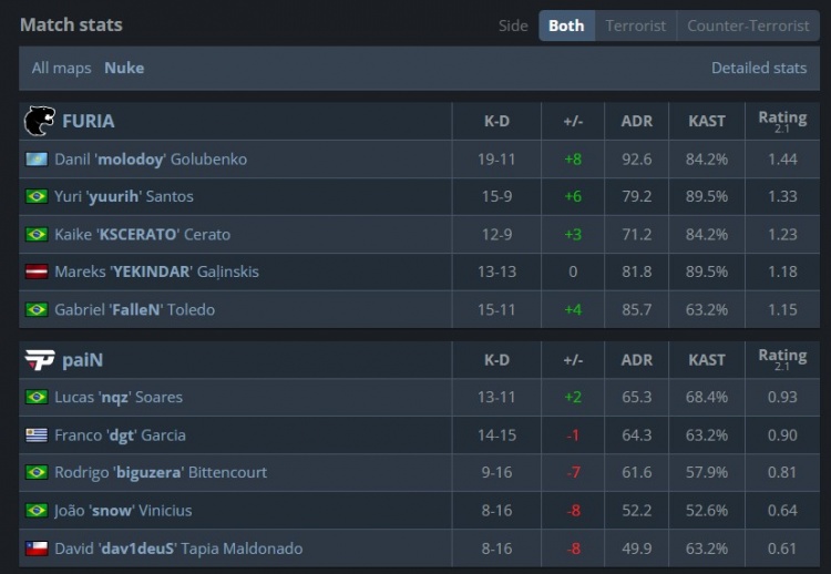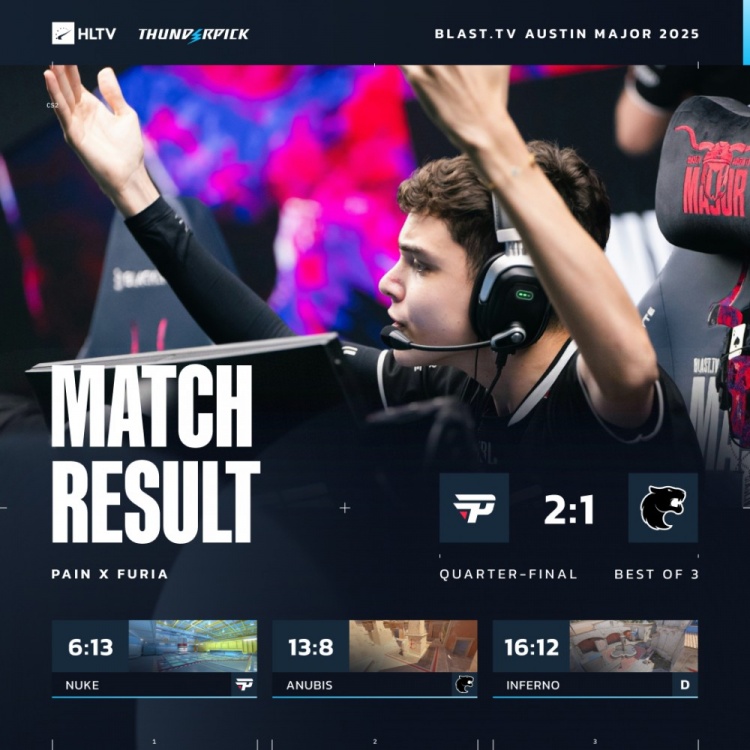 直播吧6月20日讯 CS2奥斯汀Major来到淘汰赛,今日第二场比赛由FURIA对阵paiN!凭借图三半场连追7分,paiN完成让一追二击败黑豹赢下巴西内战,历史首次晋级major半决赛!他们的对手将会是FaZe与Mongolz之间的胜者。