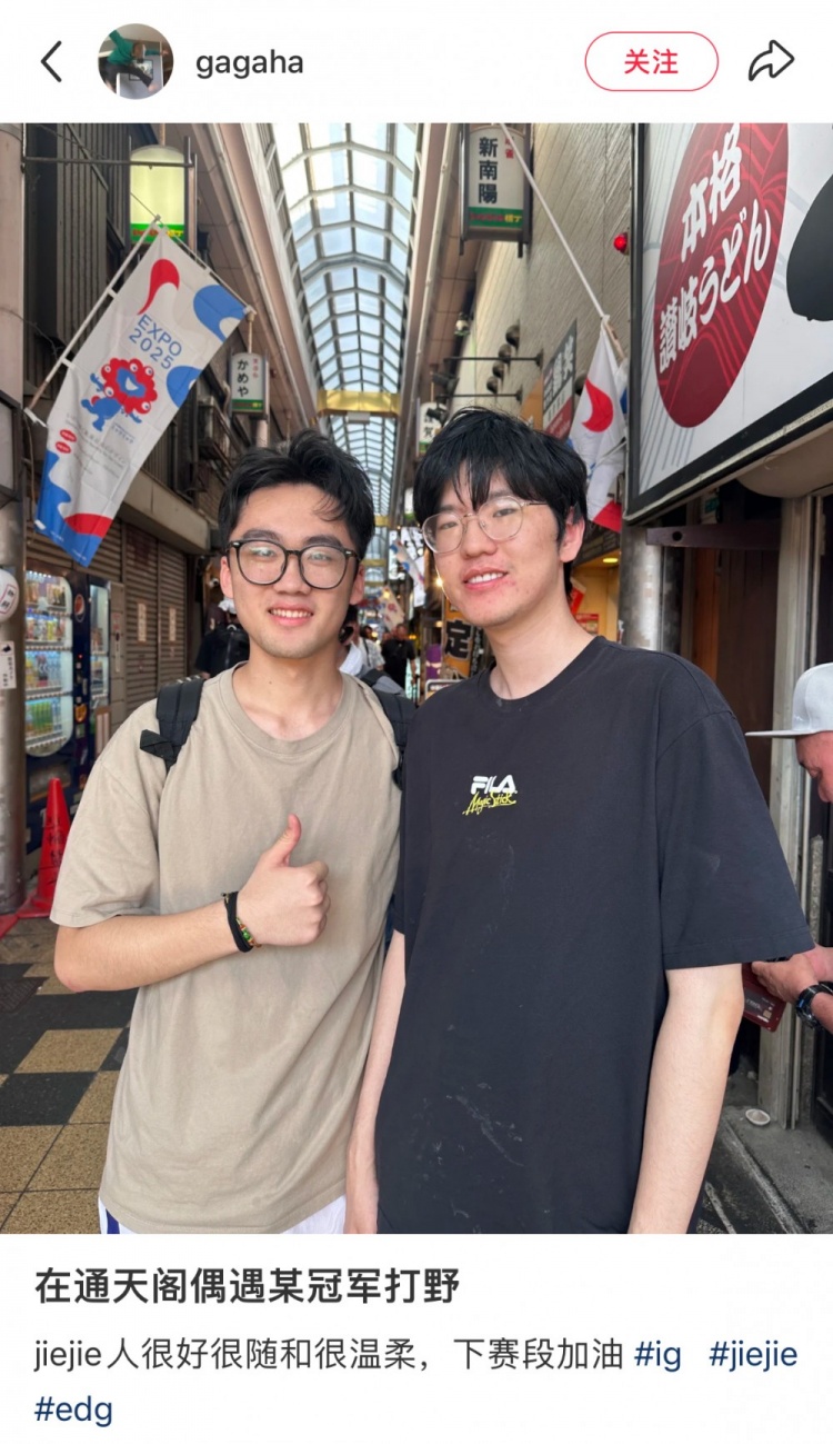 小红书上有网友发帖晒出了自己和IG打野Jiejie的合照,并表示大阪通天阁偶遇。