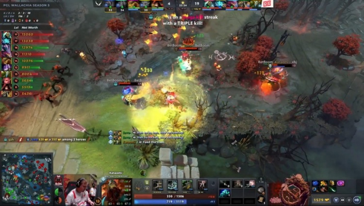 【19:41】kataomi先知在野区被XG三人控住后阵亡,随后XG四人吃掉魔晶,经济劣势依旧存在5k。