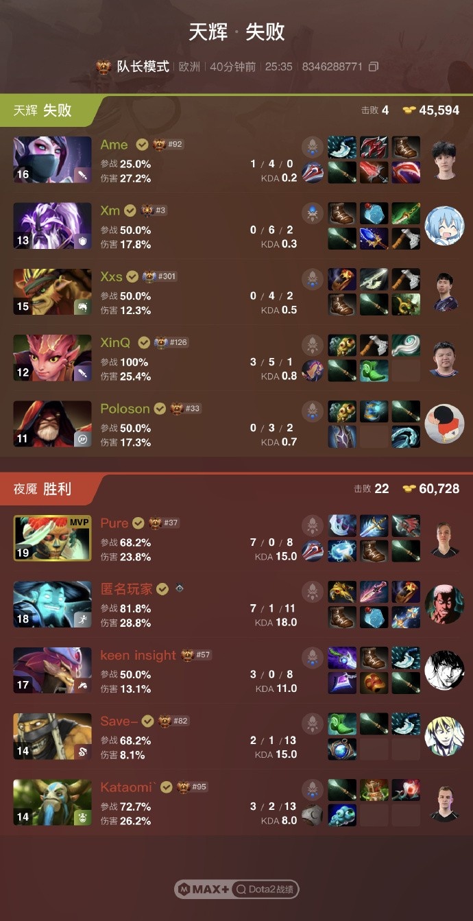天辉方XG: Ame圣堂刺客、Xm紫猫、Xxs钢背、XinQ花仙子、poloson术士