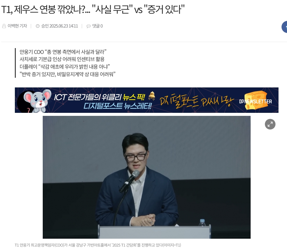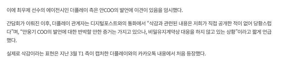 在会议之后Zeus经济公司The Play和媒体进行了通话,在通话中经纪公司表示:“关于降薪的内容我们并没有直接公开过,所以感到有些困惑,我们确实有足够反驳T1 COO发言的证据,但由于保密协议的限制,暂时无法作出公开回应。”