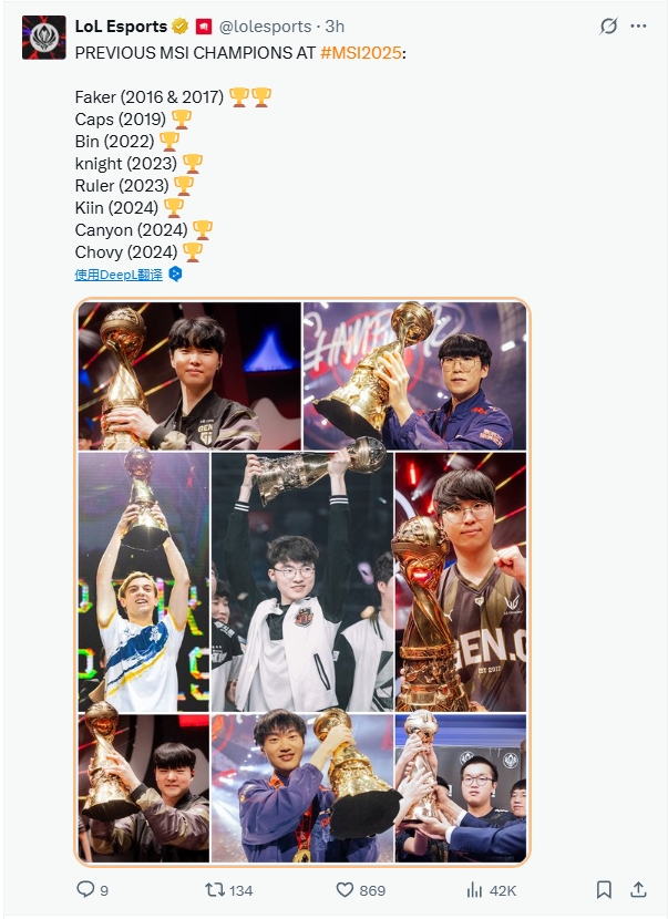 直播吧06月26日讯 2025温哥华MSI即将开赛,LoLesports官推晒出了参与本届MSI的选手中的历届MSI冠军。