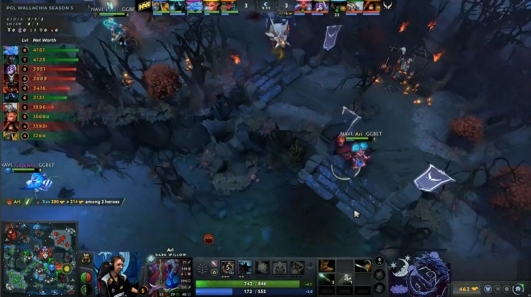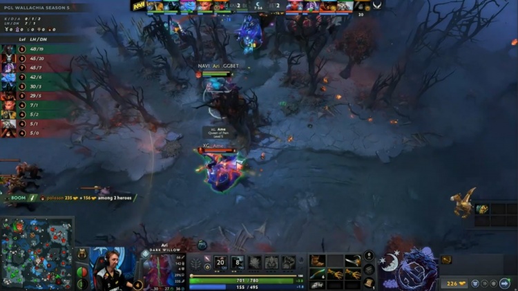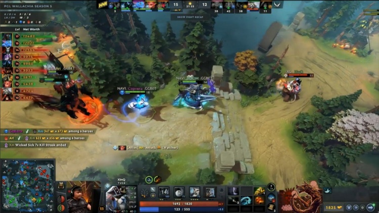 【12:36】上路团战,Ame人群中先杀Ari,但Copy帕克反手双杀带走哥哥,NAVI打出1换2,Xxs与XinQ下路推塔,BOOM亚巴顿与复活的Ari双TP下来守塔得手。