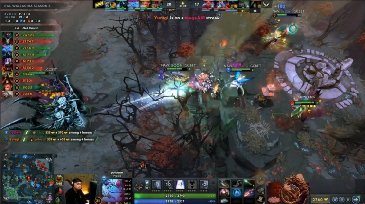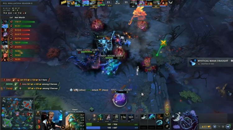 【32:52】下路团战,Ame开BKB后方打残Kaori,copy进场反杀Ame女王,BOOM留人杀掉poloson,哥哥买活排眼再次被杀,NAVI打出0换3,经济领先1w3k。