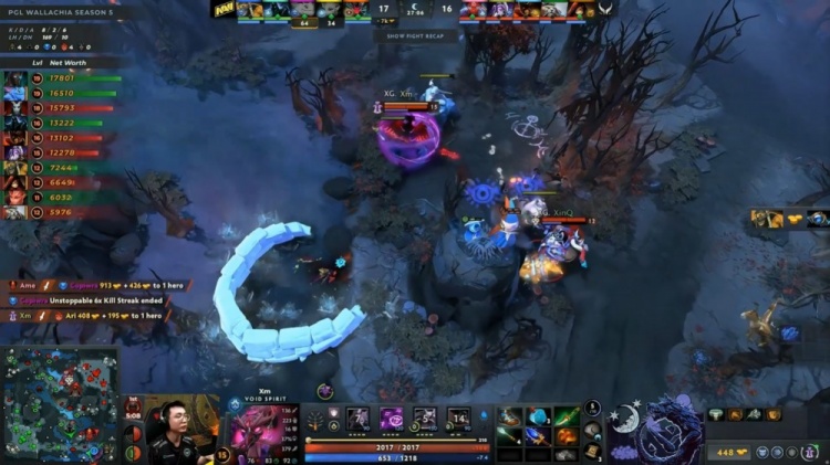 【10:03】河道团战,XinQ被小Y变羊后阵亡,但Kaori被Xm反手带走,双方打出1换1。紧接着Xxs下路又被逮捕,中路XG三人冲塔再杀Ari花仙子,XM再拿一个人头。